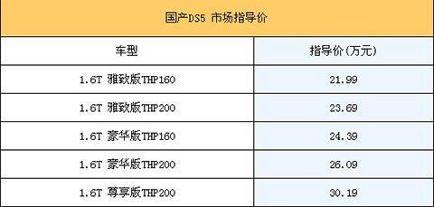 9月27日,長安標致雪鐵龍國產(chǎn)新DS5正式上市銷售,相比在售進口版車型,該車增加了1.6T高功率版新車。該新車本次共推出了1.6升排量的5款車型,售價區(qū)間為21.99萬-30.19萬,各車型具體售價如下表所示: